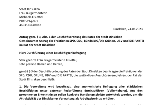 Die UBV setzt sich für eine transparente und moderne Verwaltung in Dinslaken ein, die nicht nur den Bürgerinnen und Bürgern, sondern auch den städtischen Beschäftigten gerecht wird. Um die Attraktivität der Stadtverwaltung als Arbeitgeberin zu erhalten und zu erhöhen, unterstützen wir daher den gemeinsamen Antrag der Fraktionen der SPD, CDU, GRÜNE und DIE PARTEI, für eine umfassende Beschäftigtenbefragung unter externer Federführung.